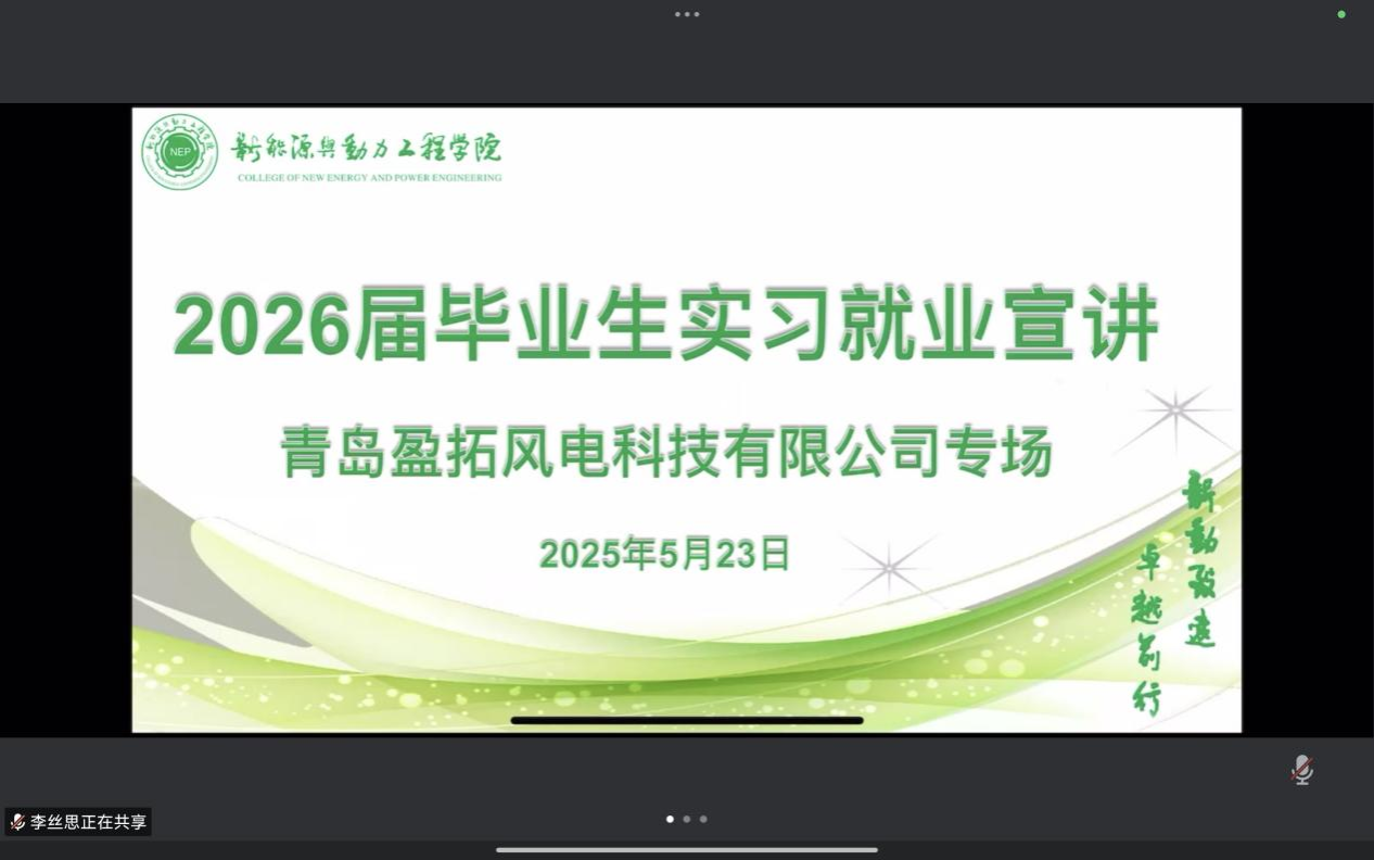 (图文/杨苏剑)为进一步做好2026届毕业生实习就业工作,切实为毕业生和用人单位搭建更加便捷有效的交流平台,进一步促进校企合作,5月23日,我院邀请青岛盈拓风电科技有限公司为学生开展线上专场宣讲会。