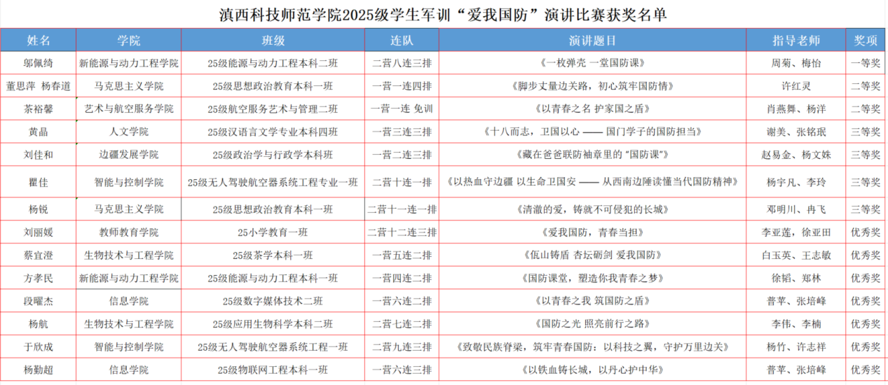(文/周菊 图/滇院青年新媒体中心)12月28日,学校2025级学生军训团“爱我国防”演讲比赛圆满落幕。我院学子在比赛中表现突出,载誉而归。其中,邬佩绮同学荣获校级一等奖,方孝民同学获得校级优秀奖。